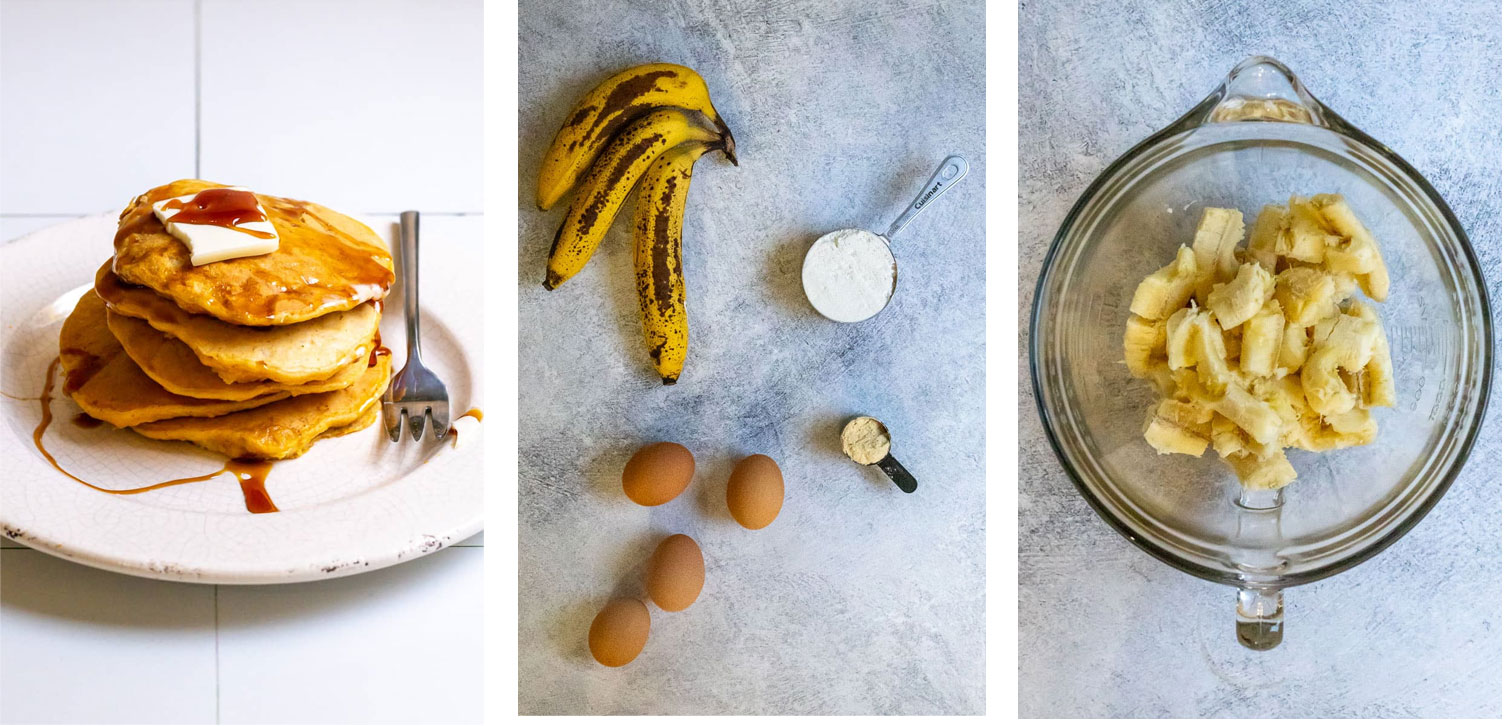Lately I've been on a peanut butter banana pancake kick There are just some flavors that go together, and some foods that do a particularly good job of satisfying the appetite. Peanut butter? Bananas? Check and check. If you're looking for ways to refresh your morning menu, these pancakes might be a great starting point. While they're still a bit of an indulgence (I mean, maple syrup!), I like that I can control the amount of sweetness in the batter by choosing peanut butter powder with no added sugar. With only five ingredients, peanut butter banana pancakes are simple to prep and even keep well for late